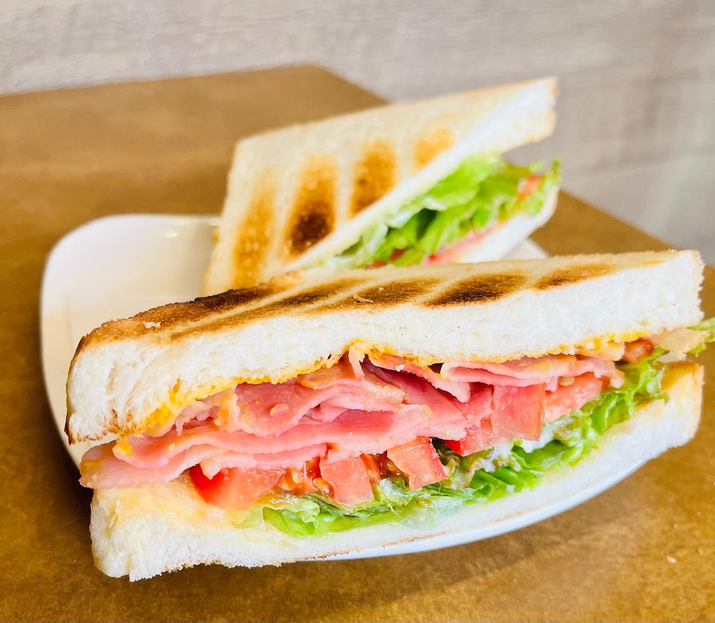 - 外は香ばしくキツネ色、中はしっとり焼き上げたトースト、 お肉屋さん特製の焼き立てベーコンを 厚切りトマトとサニーレタスをサンドした 大島コーヒー定番のサンドイッチです。