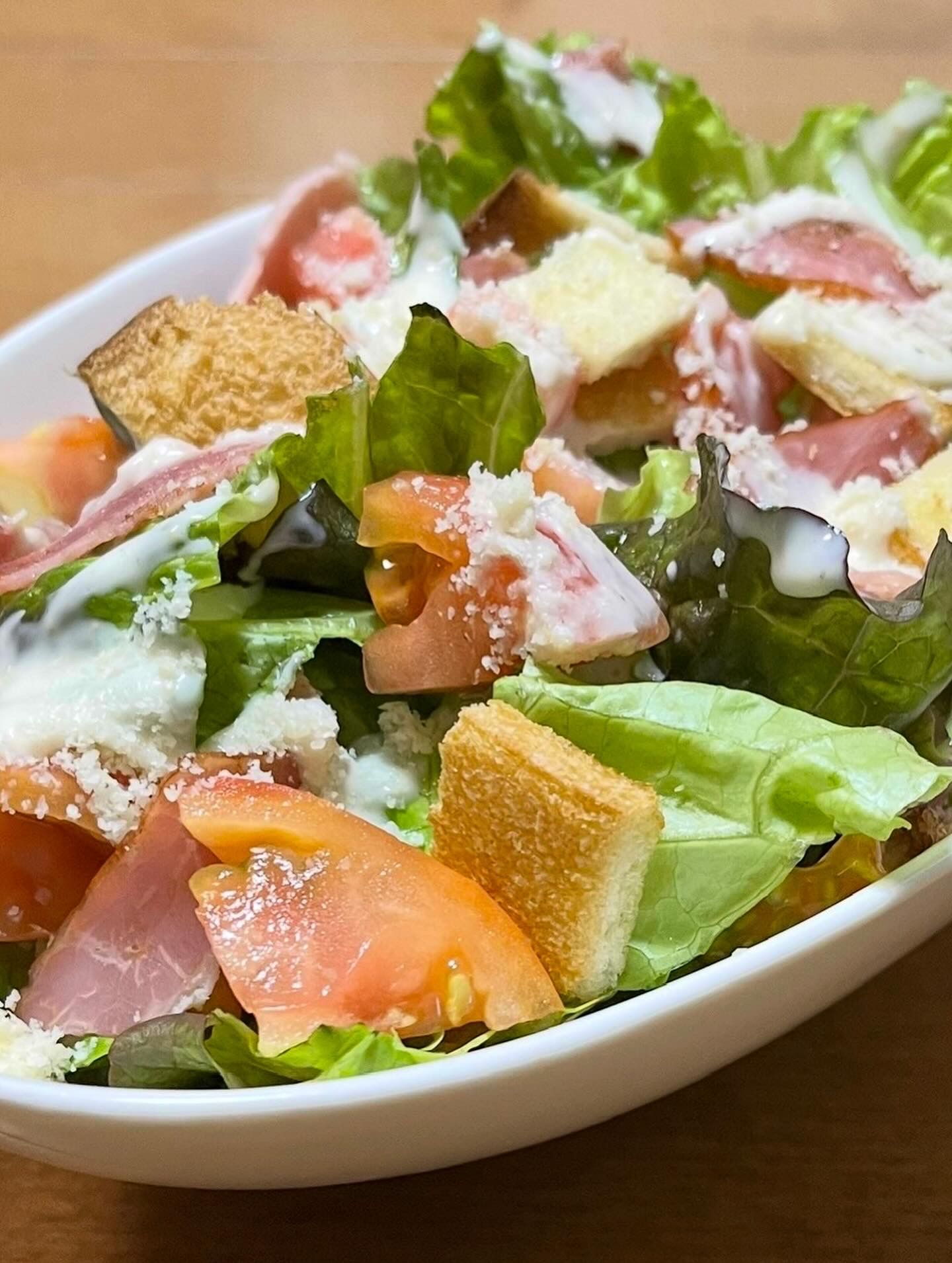 - シャキッとレタスに、相性抜群なカリカリベーコンをのせました。 香ばしいクルトンや粉チーズもトッピング。クリーミーなソースで新鮮野菜をたっぷり食べられます。